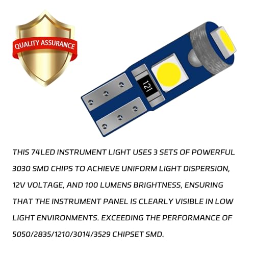 - Replacement Models: This 74 led bulb is widely applicable and can replace T5, 37, 2721, 17, 27, 58, 70, 73, 7479, 85, 86, 206, 207, 286, 306, 307, 308, 406, 407, 18, 24 and other models. It comes with a PC74/PC39 twist-lock socket, Wide Application: This T5 led bulbs can replace various vehicle lighting components in cars, including dashboard lights, reading lights, center console lights, door lights, interior lights, high beam lights, and parking brake lights, Ultra-Bright : This 2721 bulb uses 74 LEDs and 3 powerful 3030 SMD chips, providing 100 lumens of brightness and even, bright light, ensuring the driver can clearly see the dashboard even in low-light conditions, Long Lifespan: Our LED dash lights are made of high-quality aluminum + LED, equipped with an intelligent heat dissipation system and waterproof design to prevent short circuits and ensure long-term stable operation, Easy Installation: This dash light bulb is very easy to use, plug and play. Simply insert the bulb into the socket, then rotate the PC74/PC39 socket until it is securely locked into the dashboard slot