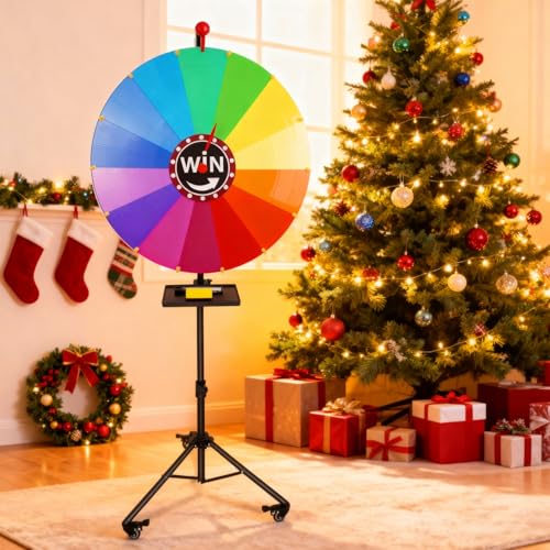 - Adjustable & Stable Tripod Stand: The height can be easily adjusted from 90 to 165 cm (including wheel). The three-leg tripod base with lockable rolling wheels ensures stability and easy mobility for both indoor and outdoor use., 14 Vibrant Slots for DIY Fun: Features a 60 cm diameter wheel with 14 colorful sections — ideal for customising your own prizes, games or tasks. Perfect for school events, trade shows, office activities or party games., Writable Dry-Erase Surface with Accessories Included: The plastic wheel surface is dry-erase compatible for endless reuse. Includes a marker and eraser so you can write, wipe and redesign your content any time you like., Easy Assembly & Compact Storage: Comes with a screw kit and clear installation manual for quick setup in minutes. The tripod and wheel can be disassembled for compact storage and transport — ideal for event organisers on the go., Smooth Spinning & Durable Build: Precision bearing ensures a smooth and balanced spin every time. Made from sturdy plastic materials with reinforced connection parts for long-lasting fun and professional use.