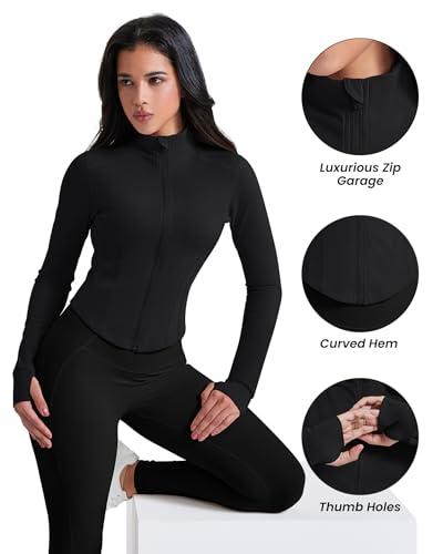 AVGO Workout Jacket for Women Zip Up Cropped Running Jackets Athletic Yoga Gym Tops with Thumb Holes (Z-Black, M)