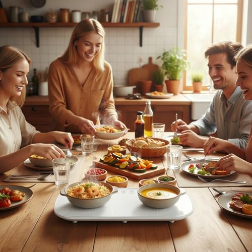 - Reliable Heat Performance: Designed with micro-arc 3D heating technology and a circumferential heat flow mechanism, the Electric Warming Tray ensures consistent warmth distribution, offering convenience and satisfaction, Advanced Heat Control: Engineered with overheat transmission prevention, the warming mat for food ensures consistent and controlled heating performance, enabling users to serve hot meals safely and conveniently, Stain-free Top: Crafted with oil-resistant tempered glass, the Food Warming Mat provides a spill-proof design that simplifies maintenance, making it ideal for families who need quick cleaning after meals or gatherings without extra effort, Space-saving Design: The warming trays for food feature a compact structure that optimizes kitchen space, ensuring cabinet gap compatibility while maintaining aesthetic-functional integration, Ceramic-glass Plate Compatibility: Engineered to suit modern kitchen needs, the heating mat for food seamlessly integrates with ceramic-glass plates and other common tableware items. Its open-slot versatility ensures secure positioning of irregular vessels