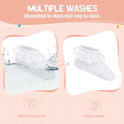 - Softness Baby Socks – Crafted from a breathable combed cotton blend, these baby socks offer gentle comfort for your baby's delicate skin, effectively reducing irritation and keeping little feet cozy during daily wear., Adorable & Breathable Design – Looking for kids socks that are both stylish and breathable? Our design features a cute lace-trimmed ruffle cuff with airy mesh panels. This combination keeps little feet well-ventilated and dry, adding a sweet, stylish finish perfect for everyday outfits., Stretchy Ribbed Cuff & Gentle Fit – The gentle, elastic ribbed cuff is designed to stay put without being tight, preventing red marks on delicate skin. Easy for parents to put on and take off, it provides a secure fit that stays comfortable through crawling, cruising, and play., Perfect for Every Occasion – Perfect for daily activities like daycare and playdates, while also perfect for special family outings, celebrations, and photo-worthy moments. These socks are a reliable and sweet complement to your child's wardrobe for any occasion., Thoughtful & Value Pack – The 5-pair set offers multiple colors for easy mixing and matching, providing great everyday value and making it a perfect gift for baby showers and new parents.