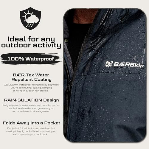 - ELITE 20,000mm WATERPROOF PROTECTION: Engineered with proprietary BÆR-Tex coating, this jacket offers twice the waterproof rating of standard rain shells. Every seam is silicone-taped and every zipper is sealed to create a "dry storage vault" for your body, ensuring you stay 100% dry even in heavy, sustained storms and snow., PFAS-FREE & ECO-CONSCIOUS SAFETY: While other brands use "forever chemicals," the BÆRSkin 2.0 is lab-tested by SGS to be 100% PFAS-free. Our BÆR-Tex water-repellent coating provides hardcore protection without risking your health or the environment, meeting the highest EPA safety standards., REVOLUTIONARY 3-IN-1 ZIP SYSTEM: Designed for modular warmth, the Heavy-Storm 2.0 features a unique dual-zip system. It integrates seamlessly with the BÆRSkin Hoodie 4.0, transforming your light rain shell into a thermal, fleece-lined winter parka that prevents "wet out" while locking in body heat., PACKABLE & ADVENTURE-READY: Never get caught unprepared. This lightweight tactical jacket folds into its own integrated stash pocket in less than 5 seconds. Perfect for hiking, cycling, camping, or commuting, it fits easily into a backpack or glove box without taking up valuable space., RIPSTOP DURABILITY & TAILORED FIT: Built with 100% Polyester Ripstop fabric to resist snags, tears, and mud. Features "Rain-Sulation" design with adjustable wrist toggles, waist cinches, and a brimmed storm hood to prevent leaks during sideways rain and high-wind conditions.