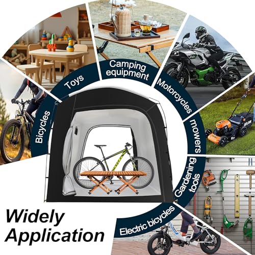 - 【All-Weather Protection Storage tent】Storage tent is made of 210D Oxford cloth and PU4000 waterproof material. The fabric joints of the tent use double-layer edge stitching technology with outdoor bike shed are all covered with waterproof tape, which can better withstand rainwater or snow invasion. Reinforce the seams and waterproof bottom to ensure your items stay dry. 10 MM Bold fiberglass support rods, ground studs, and wind ropes provide stability in harsh weather conditions., 【Powerful Storage Function】 MAIZOA outdoor storage tent has been upgraded to a new size, with a size of 118*86*72 inches, making it easier to store bicycles, motorcycles, gardening tools, or camping equipment. Our bicycle tent maximizes vertical space and provides 50% more capacity than standard shacks, making it perfect for households that require orderly and clutter free backyard storage.It can also be used for motorcycle riding and patio storage. It's a great gift for cycling enthusiasts., 【Durable & Human-centered Design】 The double zipper and ventilation window provide quick access and ventilation.The zipper can completely seal the door and provide comprehensive protection.preventing mold from forming under humid conditions and rejecting the potential damage of rainwater, dust, and sunlight to items.provide comprehensive protection against water, dust and insects., 【Quick Setup & Portable Carry】 Designed for busy families, these outdoor storage tents set up in 10 minutes like a camping tent—no tools required! You only need tent pole is inserted into the tent pole cover in turn. After storage measuring 15.5*6.5*6.5 inch and weighing just 14.33 pounds Portable and lightweight, they’re perfect for patios, garages, or camping trips, keeping bikes and tools secure yet accessible., 【Wide Application】 The outside storage tent is different from regular bike covers it can not only store the bicycles but also can store motorcycles, repair tools, long handled garden tools, outdoor toys, lawn mowers, pool items and other outdoor equipment, It can easily solve your storage problems. can bring you a great outdoor experience is your ideal choice.,they’re perfect for camping, picnicking or outdoor activities, keeping bikes and tools secure yet accessible.