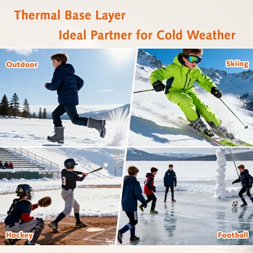 - Exceptional Comfort for Little Explorers: Our kids thermal base layer is designed with ultra-soft fleece lined fabric that feels like a gentle hug against your child's skin, ensuring all-day comfort whether they're playing outdoors or resting indoors. The thermal underwear kids offers a snug yet flexible fit, allowing for unrestricted movement, making it the perfect base layer under sports gear or winter attire., Superior Moisture Management for Active Days: Equipped with advanced moisture-wicking technology, our boys hockey base layer efficiently absorb and rapidly dry sweat, keeping your child dry and comfortable during rigorous activities like hockey, soccer, or running in cold weather. This feature also helps to eliminate odors, ensuring freshness and hygiene throughout the day, so your kids can stay active and odor-free., Unsurpassed Warmth for Chilly Adventures: The stretchy brushed interior of our kids long johns set provides exceptional warmth, making it perfect for cold winter nights as ultra-soft baselayer or for outdoor adventures in chilly conditions. It offers outstanding heat retention, ensuring that your child stays comfortably warm without overheating, whether indoors or during moderate outdoor temperatures, providing a cozy layer of protection against the cold., Durable Quality for Long-Lasting Use: Made from high-quality materials, our boys thermal underwear set are built to last, withstanding frequent washing without losing shape, color, or functionality. These sets remain in excellent condition after numerous washes, offering great value for money and ensuring that your investment in comfort and warmth lasts through many seasons., Versatile Functionality for Every Occasion: - Our hockey undergarment kids is incredibly versatile and multi-functional. It can be worn as long johns for added warmth during winter sports like ice hockey, football, and skiing, providing an essential layer of insulation. - It also serves as comfortable skins for cold nights or casual wear at home, making it a practical choice for toddlers and older children alike.