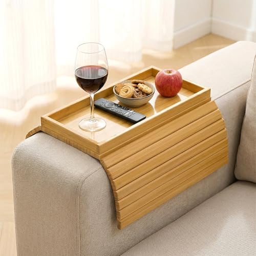 - 【The Ultimate Sofa Tidiness Companion】This couch armrest table is designed to hold drinks, phones, and remotes, keeping your sofa area tidy at all times. It enhances the comfort of your leisure time, banishes clutter, and lets you enjoy an organized life, 【Natural Bamboo, Safe & Durable】This sofa arm tray is made of 100% natural bamboo, free from any harmful substances, ensuring safety and durability. The bamboo surface is easy to clean, and its simple color tone easily complements various home styles, adding a natural touch to the living room, 【Multi-Functional & Space-Saving】This couch arm tray is versatile and space-saving. It's ideal for placing snacks while watching movies, storing knitting tools for crafting, holding coffee while reading, or even storing the TV remote when unattended. Its foldable design conserves space, 【Non-Slip & Secure, Wide Compatibility】This couch cup holder is equipped with a non-slip pad on the back, which can fit tightly to the armrest of the sofa, preventing slipping and spilling of drinks, thus protecting the surface of the sofa. It is suitable for armrest widths ranging from 4.4 inches to 14 inches, and is compatible with most sofas and armchairs, 【Easy Installation, Household Essential】This couch caddy requires no tools—simply place it on the armrest for instant convenience. Perfect for enhancing comfort in living rooms, dorms, or offices. Includes professional customer support for worry-free purchasing