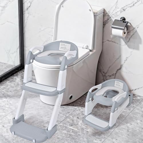 - 2-IN-1 VERSATILE DESIGN: This innovative potty trainer seamlessly transforms from a standalone floor potty to a toilet seat with an step stool ladder, adapting effortlessly as your child progresses through their potty training journey, ADJUSTABLE & SECURE FIT: Designed for versatility, our potty trainer features 5 adjustable heights (ranging from 42 to 50 cm (approximately 16.5 to 19.7 inches) to ensure a fit for most standard adult toilets. Customize the height easily for optimal comfort and safety, SOFT PU CUSHION: Equipped with a plush PU cushion, this potty provides a gentle touch against your child's skin while ensuring easy cleaning. The waterproof material ensures hygiene and durability, making it a practical choice for everyday use, STABLE & ANTI-SLIP: Crafted with a robust frame and non-slip foot pads, our potty trainer guarantees maximum stability. The easy-grip handles empower your toddler to climb confidently, promoting independence during their potty training experience, QUICK ASSEMBLY: Say goodbye to complicated setups! Our potty training seat can be assembled quickly without any tools. Plus, its foldable design makes it convenient to store away when not in use, EASY-GRIP HANDLES: Features sturdy side handles that provide secure support for your child while climbing up and sitting down, helping to build confidence and independence during toilet training, SPACE-SAVING FOLDABLE DESIGN: The compact foldable structure allows for easy storage in small bathrooms or closets, making it convenient for families with limited space while maintaining full functionality when in use