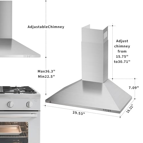 30 Inch Wall Mount Range Hood,250 CFM Stainless Steel Kitchen Vent,3-Speed Button Control & LED Lighting,Aluminum Baffle Filters,Ducted/Ductless Convertible