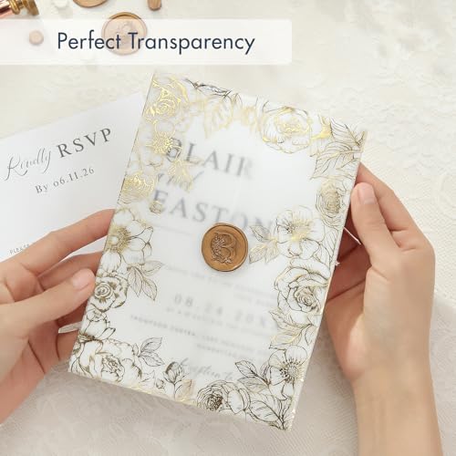 50 Pack Pre-Folded Vellum Jackets for 5x7 Invitations,AZAZA Gorgeous Translucent Invitation Sleeves,115GSM Vellum Jackets 5x7, Wedding Invitation Accessories,for Weddings Birthdays,Real Gold Foil