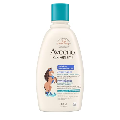 - CURLY HAIR CONDITIONER: Aveeno curly hair conditioner for kids, infused with oat extract and shea butter, gently nourishes and hydrates hair to smooth and define curls; infused with a light scent; designed for kid's curly hair, MOISTURIZING: Kid's curly hair conditioner is specially designed for kids' developing curly hair; improves hair's manageability, defines curls, controls frizz and hydrates for soft and smooth hair, BENEFITS: Aveeno kid's curly hair hypoallergenic conditioner is formulated without parabens, phthalates, sulfates, dyes & Phenoxyethanol; natural fragrance that is known to be as gentle on skin as fragrance-free products, HOW TO USE: The ideal haircare product to add to your child's daily routine; After using the Aveeno Kids Curly Hair Shampoo, dispense into palm, gently work downward through hair and rinse thoroughly. Best used alongside Aveeno Kid's Curly Hair Shampoo, INCLUDES: One 354 mL Aveeno Kids Curly Hair Conditioner; a pediatrician and dermatologist recommended brand; features a tear-free formula and ease of use for parents and children