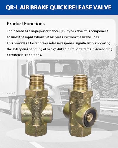 - Massive Compatibility & Cross-Reference - Directly replaces numerous part numbers including Bendix 800333 & 065707, 5003394, Meritor R955800333N, Volvo truck 3093937, Mack 745-800383, and Tectran 14482. Compatible with Freightliner, Navistar, and MCI buses., Precision 1/2" NPT Port Sizes - Features industry-standard 1/2-14 NPT threads (Male Supply Port and Female Delivery Port) for a secure, leak-free connection. The compact 3.4-inch direct-mount design allows for easy installation in tight chassis spaces without compromising airflow performance., Rapid Brake Release Response - Engineered as a high-performance QR-L type valve, this component ensures the rapid exhaust of air pressure from the brake lines. This provides a faster brake release response, significantly improving the safety and handling of heavy-duty air brake systems in demanding commercial conditions., Heavy-Duty Die-Cast Construction - Built to withstand the harsh conditions of long-haul trucking. Constructed from premium die-cast zinc, these valves are rigorously tested for high-cycle durability, corrosion resistance, and structural integrity, meeting OEM standards for commercial vehicles., Professional 2-Pack Value Set - This kit includes two (2) Inline Quick Release Valves, allowing you to service both sides of an axle or keep a critical spare in your tool box.