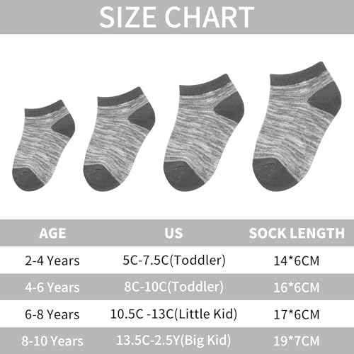 - 12-Pair Value Pack: Our boys socks come in a convenient set of 12 pairs, perfect for the back-to-school season. With ample options, your little one will always have a fresh pair ready for any day., Soft and Breathable Material: Made from a blend of 20% cotton, 75% polyester, and 5% spandex, these boys ankle socks ensure a comfortable fit that is both soft and breathable, keeping little feet cozy all day long., Size Range for Growing Kids: Available in four sizes (2-4, 4-6, 6-8, and 8-10 years), our kids socks cater to children aged 2 to 10 years, providing the perfect fit as your child grows., Versatile for Any Occasion: Whether for sports, school, casual outings, or lounging at home, these toddler ankle socks are designed for versatility, making them an essential addition to any child’s wardrobe., Colorful Variety for Every Mood: With multiple color options available, these toddler socks allow for daily style changes, so your child can mix and match to suit their outfit or mood, adding fun to their sock drawer.