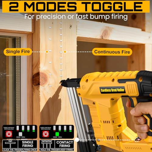 - 2-IN-1 Brad Nail/Staple Gun: This 18 gauge brad nailer drives a wide range of 18GA brad nails (3/8"- 1-1/4") and 18GA staples (3/8"-7/8"). It comes with 1000 brad nails (1-1/4") and 1000 staples (7/8"), ready to use straight out of the box, making it a versatile tool for DIY, Home Improvement, and Woodworking, Compatible with DE WALT 20V MAX Batteries: This brad nailer cordless is compatible with the DE WALT 20V MAX battery(Including DCB201, DCB203, DCB204, DCB205, DCB206, DCB208, DCB210 etc.) It offers ultimate flexibility for professionals who already own DE WALT batteries, allowing you to power your staple gun for wood with your preferred, high-performance battery and charger (Note: Battery is not included, 4.0 Ah+ batteries recommended for optimal performance), Dual Firing Modes for Versatility: This cordless nail gun comes with single firing mode (designed for precise nail placement) and sequential firing mode (enabling rapid, continuous nailing to boost efficiency for high-volume tasks), allowing you to tailor your nailing approach to the task at hand while ensuring both speed and accuracy, User-Friendly & Ergonomic Design: This battery powered nail gun prioritizes comfort and ease of use, with a lightweight build and ergonomic handle to reduce user fatigue during extended projects and a magazine that holds up to 100 nails to cut down on downtime from frequent reloading, making it ideal for both professional carpenters and home improvement enthusiasts, Advanced Brushless Motor: Engineered for superior performance, this upgraded brushless motor delivers powerful, jam-resistant driving with extended runtime, reduced overheating, and enhanced durability, backed by integrated protection systems for a longer service life, Enhanced Double Protection Mechanism: Our electric brad nailer features a foolproof double - protection system with a switch and safety contact. The nail gun for wood only fires when both the switch is activated and the safety contact is fully pressed against the object surface, effectively preventing accidental starts and ensuring your safety, Premium After-Sales Support: Backed by a 12-month warranty and 24/7 customer service, we provide comprehensive assistance for installation, operation, and troubleshooting to ensure your driving nails experience remains smooth and worry-free