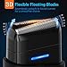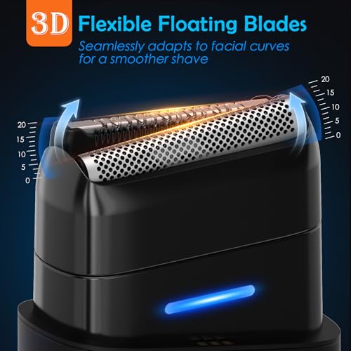 - 【Professional Dual-Blade Architecture】Go beyond basic shaving with a professional dual-head system. The electric foil shaver combines the foil shaving head with the long-hair trimmer head, working in tandem to precisely detail sideburns, shape mustaches, and neatly edge your beard. The 3D floating design allows the ultra-thin foil mesh to conform to your facial contours, ensuring a constant and close contact with the skin for a smooth and comfortable shave., 【Gentle on Your Skin & Stay Fresh】Designed with comfort in mind, the electric shaver employs a 0.05mm skin-friendly foil mesh and a gentle cutting system to reduce pulling and tugging on the hair, thereby minimizing skin irritation and redness. To ensure ongoing freshness, the shaver features a simple self-cleaning cycle—simply place the protective cap back on to activate a 20-second automatic u/~v light cleaning process, signaled by a blue indicator light. Always ready for the next use., 【Fully Washable for Wet & Dry Shaving】Enjoy ultimate flexibility and easy cleanup with a completely IPX6 waterproof design. The electric razor for men allows you to shave your way—use it dry for a quick touch-up, or pair with your shaving cream, gel, or even in the shower for a soothing wet shave. It features a magnetic detachable head. After use, simply rinse it under running water for a few seconds to wash away hair and gel residue. Once it is completely dry, put on the protective cap., 【USB-C Fast Charging & Extended Runtime】Stay powered and ready with a modern charging system designed for convenience. The Men's electric shavers fully charges in about 90 minutes and provides approx. 100-120 minutes of cordless shaving—enough for weeks of daily use. Clear LED indicators clearly show battery levels in real time, so you’re never caught off guard. Grab the universal USB-C cable, and keep your shaver ready anywhere., 【Ultra-Compact & Travel-Ready】Measuring just 9.7 x 5.8 x 2.8cm and weighing a mere 120 grams, our electric face shaver slips easily into any travel bag, jacket pocket, suitcase, or toiletry kit. To prevent accidental activation on trips, the power switch will be automatically disabled when the protective cover is attached. This portable foil shaver will be the ideal on-the-go grooming companion for business trips, vacations, or your daily commute, ensuring you look your best anywhere, anytime.