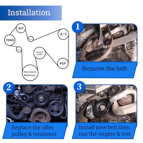 - 【FIT FOR 3.6L V6 ENGINE】This complete serpentine belt drive kit compatible with Chrysler 200 (2012-2014), Town & Country (2011-2016); Compatible with Dodge Avenger (2013-2014), Grand Caravan (2011-2016), Journey (2013-2019); Compatible with Ram C/V (2012-2015), 【1x Drive Belt Tensioner】OEM:39282, 5184617AD, 05184617AD, 49484, 89632.The tensioner maintains optimal belt pressure, 【1x Idler Pulley】OEM:38082, 89056015, 0002020019, 4627509AA, 4627851AA, 4792836AA, 5281301AA.Ensuring idler pulley rotates smoothly, 【1x V-Ribbed Serpentine Belt】OEM:506077, 6PK1955, K060770, K060771.The V-ribbed belt is resistant to wear and cracking, ensuring long-lasting performance, 【Function】This belt tensioner kit ensures serpentine belts remain properly aligned and tensioned, providing you with a smoother, safer, quieter, and more comfortable driving experience
