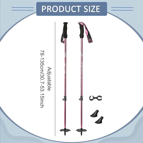 - 【Adjustable Length】: Featuring a telescopic design (78cm-135cm/30.71inch-53.15inch), these skiing poles can be adjusted to suit both adults and children, 【Comfortable Grip】: The ergonomic handle provides a comfortable and security grip, ensuring better control over various terrains, 【Aluminum alloy】: Made from quality aluminum alloy, these ski poles offer exceptional strength and durability while remaining lightweight for easy handling during your adventures, 【Upgraded Locking System】Features an improved external locking mechanism, prevent common issues like misdirection and internal screw loss, 【Wrist straps】: These versatile skiing sticks with wrist straps, fixing buckles, pole tip protectors, Pole Basket