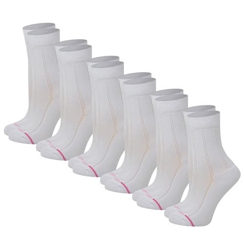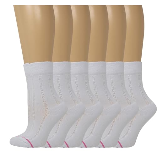 Dr. Motion Womens Diabetic Socks Non-Binding Loose Fit Wide Top Comfort Half-Cushion Crew Socks 6 Pairs, White, One Size