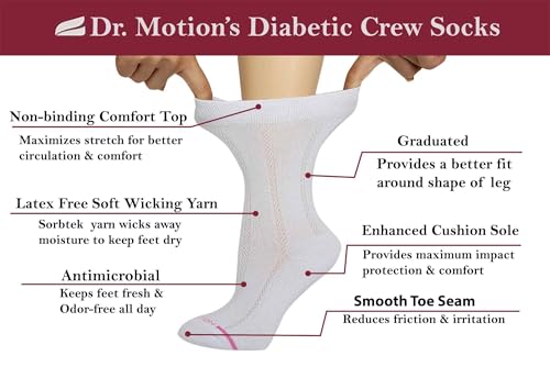 - ALL SEASONS: Our crew diabetic socks are designed for optimal comfort with just the right thickness - neither too thin nor too bulky - and light weight. They are seasonless and perfect for year-round wear in the home, office, and outdoors, with any type of pants, jeans, or dress. On top of that, they are aesthetically pleasing and make an ideal gift for friends, family, or even a special someone on their birthday, Christmas, Halloween, or other special days., COMFORTABLE DESIGN: Dr. Motion crew socks are crafted with latex-free, ultra-soft materials for optimal comfort. Constructed with a cooling effect, the socks keep feet cool in hot weather and warm in cold temperatures. The non-restrictive, breathable design provides a perfect amount of stretch, assuring a snug, comfortable fit with both casual and dress shoes., FOR DIABETICS: These lightly fitting, easy-to-wear crew socks are highly recommended for people with pregnancy, elderly, diabetes, edema, neuropathy, sensitive feet or swollen ankles. With their extra wide top and non-binding Lycra for maximum stretch, circulation is improved and swelling alleviated. For optimal comfort, these socks are designed to eliminate binding that can restrict blood flow., EXTRA WIDE TOP: These exceptionally comfy socks, with a non-binding, graduated leg and extra wide top, are designed to help improve circulation and reduce swelling. Perfect for those with pregnancy, diabetes, edema, circulatory problems, neuropathy, sensitive feet, or swollen ankles, they are easy to put on and off and provide a perfect amount of stretch. Ideal for post-surgery recovery., Contents: 38% Sorbtek Polyester 37% Cotton 23% Nylon 2% Spandex. Sock size 9-11 ( Fit shoe size 4-10 )