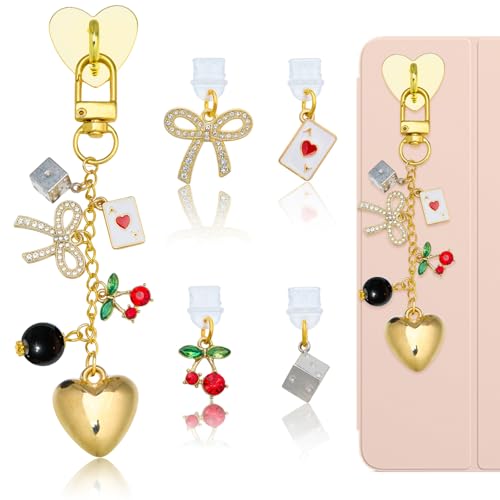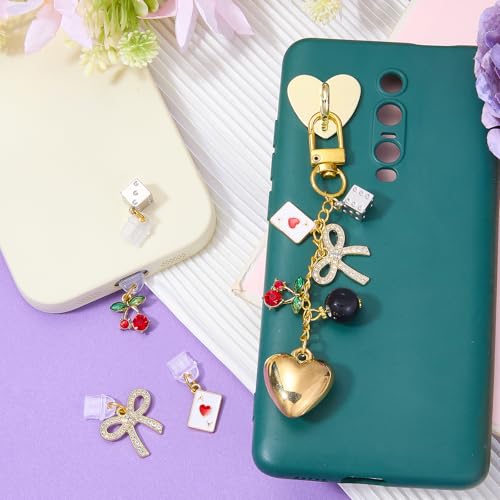 - Adorable Design: This cute phone charm set includes 1 golden chain with a heart-shaped hook and 4 matching USB-C dust plug charms. Decorated with assorted enamel charms(heart,cherry,8ball,bow,poker and dice), it adds a dreamy and stylish touch to your electronic devices, Premium Quality: Crafted from durable alloy and enamel, this e-reader charm is lightweight yet sturdy. Total length: 4.84 inches(123mm)—ideal for most gadgets, Multipurpose and Fashionable: Beyond phones, use this phone charm chain on e-reader,cameras, tablets, or bags! Its whimsical design elevates any accessory. A must-have for fashion-forward users, Easy to Use: Once you get the phone charms, you can use it immediately. Just stick the heart charm hook on the back of the device.The detachable design allows you to switch charms anytime. For the maching usb c dust plug charms, simply press the plug into the port to block dust ingress effectively, Perfect Gift for Trendsetters: A creative gift for women, readers, and book lovers who adore stylish accessories.Surprise them with this cute phone chain