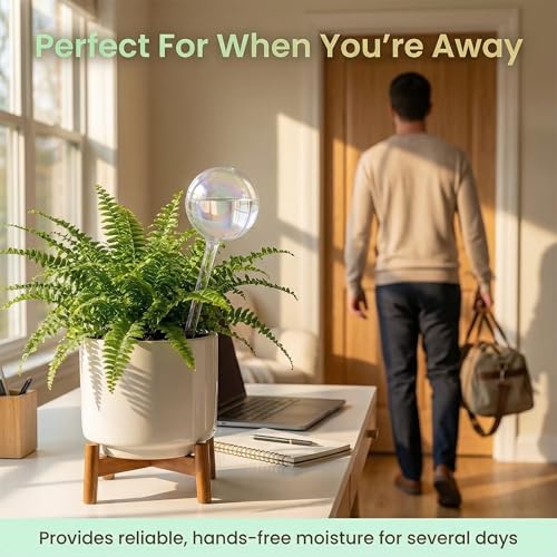 - Easy-to-Use Globe Waterer for Plants! Simply fill the bulb and insert into the soil., Works for Indoor & Outdoor Plants!, Embellish your Plants with our Iridescent Glass Watering Device., Piece-of-Mind Vacation! A watering system that slowly releases water for up to 7 days., Perfect for all Kind of Plants! Measures 8.8" L x 3" D and a volume of about 7 oz.