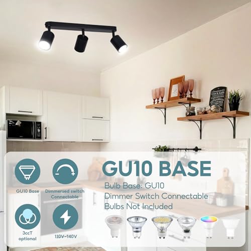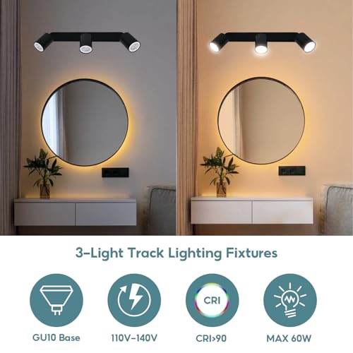 - [SMALL-SIZED TRACK LIGHT - FITS CEILING HOLES UNDER 1.5 IN DIAMETER] - This product is a small-sized track light, measuring 14.9 in × 1.5 in × 5.5 in (L×W×H). It does not come with a ceiling box and is only suitable for installation in ceiling holes with a diameter of less than 1.5 in. Please carefully check the dimensions before placing your order., EASY INSTALLATION - This modern track lighting fixture is pre-wired, making the installation a breeze. With a complete hardware kit, spare parts, and user manual included, all you need to do is screw it onto the ceiling canopy and then connect the power cord. However, we advise using a professional electrician for installation to ensure safety., ADJUSTABLE LIGHTING - Designed with adjustable arms that can rotate 180° horizontally, this black track spotlight is perfect for any room. Light up your art exhibition, and photo frame with ease while enjoying the flexibility to customize the angle of your lighting., TECHNICAL SPECIFICATIONS - Bulb Base:GU10, Max: 50W,1500 lm, Dimmer switch connectable:3CCT - 3000K/4000K/5000K. Voltage: 110-140V. Material: aluminum and metal.Installation Type: Semi-Flush Mount, Product Size:14.9"L x 1.5" W x 5.5"H, PLENTY OF LIGHT&FITS ALL GU10 BULBS - With 3 lights, this rotatable track ceiling light is compatible with GU10 bulbs up to 50W, and it is fully dimmable when connected to a dimmer switch and using a dimmer bulb. provides ample lighting to protect your eyesight without sacrificing style. Perfect for reading, playing games, or hosting guests.