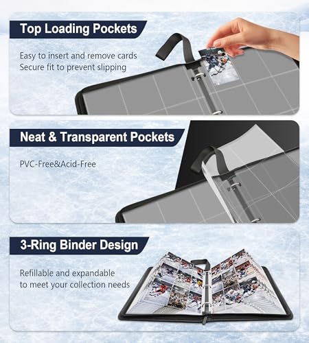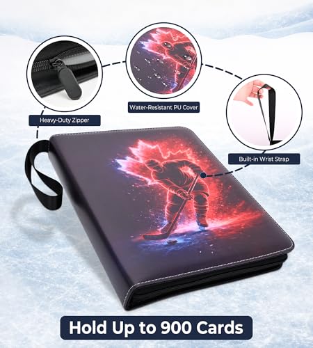 - Built for NHL Cards: Designed specifically for hockey and ice hockey fans, this hockey card binder fits standard 2.5"×3.5" cards perfectly, making it a true NHL card binder built for serious card collection and long-term card protection, Massive 900-Card Capacity: With large capacity storage of 900 pockets, 50 double-sided 9 pocket pages keep your growing trading cards collection organized in one hockey card album, eliminating the need to replace binders as your collection expands, Safe Acid-Free Pages: Premium inner pages are acid free, no pvc, and crystal clear, protecting valuable cards from fading or sticking, while smooth binder sleeves allow easy viewing and secure card storage for years, Premium PU Leather Protection: Durable pu leather cover with reinforced zipper design prevents bending, dust, and moisture, delivering a professional card collector binder that looks great on shelves and travels safely, Expandable 3-Ring Design: Flexible 3 ring structure with removable pages supports evolving collections, making this hockey card organizer a perfect gift for hockey fans, families, or a kids card binder