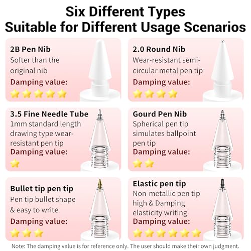 - ✔ Perfect Fit for Apple Pencil – These replacement tips with storage box are compatible with Apple Pencil Pro/ USB C/ 1st generation/ 2nd generation, and can work 100% like your original pencil tips after replacement, so you don't have to spend the expensive price to buy a new pencil, ✔ Smooth & Precise Performance –Same as the original tips for your Apple pencil, write in real-time, can accurately control the pressure and line strength, and react very quickly and without delay. You can easily draws different lines and shadows, Suitable for studying office notes, drawing and graffiti, engineering design., ✔Screen Protection – These pencil tips are made of anti-scratch metal material and will not wear or scratch your tablet screen during prolonged use. These improved pencil tips do not have to wear and replace as often as other normal pencil tips, and high-quality pencils provide a first-class experience., ✔ Easy to Install & Replace – Directly to slightly spin the Stylus Pencil replacement nib out to remove and turn clockwise to install the tip; please do not pull out or insert directly., ✔ What do You Get – You will get 3.5 Fine needle pen tip * 1, Bullet pen tip * 1, Elastic pen tip * 1, Small steel ball pen tip * 1, 2.0 round pen tip * 1,2H pen tip * 1 for ipad pencils. And our perfect after-sales service, 12 months of hassle-free replacement! If you have any questions, please feel free to contact our customer service.
