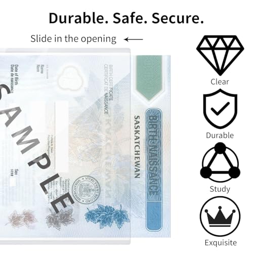 - Ideal for Canadian Families – This transparent plastic birth certificate holder is designed to fit documents from all Canadian provinces, including British Columbia, Alberta, Ontario, Quebec, and more, offering a universal solution to protect your baby’s precious certificate., High-Quality & Durable Material – Made from premium, durable plastic, this holder provides excellent protection against everyday wear, moisture, and scratches, ensuring your birth certificate stays in perfect condition for years., Clear & Protective Design – The transparent design allows full visibility of your document, making it easy to read while keeping it safe from physical damage, dirt, and spills., Single Pack & Value-Packed Two-Pack Option – We offer both a single pack and a value-packed two-pack for your convenience. Choose the option that best suits your needs, whether for personal or family use., Perfect Size & Practical Function – Measuring 5x7 inches, this holder is the ideal size for standard birth certificates and other important documents, providing a practical and stylish solution for preserving your family’s valuable papers.