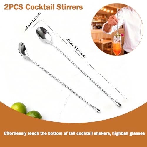 - 2-Pack 11.8-Inch Bar Spoons: Includes two 30 cm (11.8-inch) long spoons designed to effortlessly reach the bottom of tall cocktail shakers, highball glasses, and mixing jars. Perfect for stirring cocktails, coffee, iced tea, smoothies, or milkshakes., Durable Stainless Steel Build: Crafted from rust-resistant stainless steel with a sleek silver finish for lasting durability. Weighted handle ensures a comfortable grip for smooth stirring and precise drink control., Spiral Shaft Design: Unique spiral construction provides a secure grip and superior control, enabling effortless stirring, mixing, and layering of cocktails or mixed drinks for both professionals and home users., Versatile All-in-One Tool: Features a polished, rounded handle for comfortable use and a flat head to efficiently muddle herbs, fruits, or sugar. Ideal for cocktails, coffee, and other beverages., Easy to Clean & Maintain: Corrosion-resistant stainless steel construction is dishwasher-safe and scratch-resistant. Mirror-polished finish stays hygienic and pristine after repeated cleaning, suitable for bars, cafes, offices, or home use.