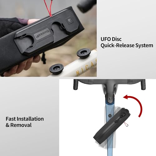 - 🚴 FSB Flying Saucer Quick-Release System: Equipped with the innovative FSB (Flying Saucer Buckle) quick-release system, this bike top tube bag can be installed or removed in seconds. Secure locking keeps the bag firmly in place even on rough roads., 🌧️ Fully Waterproof & Welded Construction: Made from eco-friendly 600D TPU polyester with RF-welded seams and waterproof sealed zipper, ensuring reliable protection against rain, splashes, and road spray during daily rides or long-distance bikepacking., ⚡ Slim Aerodynamic Design – No Knee Rub: Ultra-slim 5cm profile reduces wind resistance and prevents leg or knee interference while pedaling. The reinforced rigid top plate maintains shape and prevents sagging or deformation over time., 🔌 Built-in Charging Cable Port: Designed with a convenient cable outlet, allowing you to charge your phone, GPS, or cycling computer on the go using a power bank stored inside the bag., 🔩 Bolt-On Mount – Frame-Specific Fit: Designed exclusively for bike frames with top tube mounting bolts. Supports multiple mounting positions, including top tube or bottle cage bolt locations, making it compatible with various frame sizes and geometries. ⚠️ Not compatible with frames without top tube bolt holes.