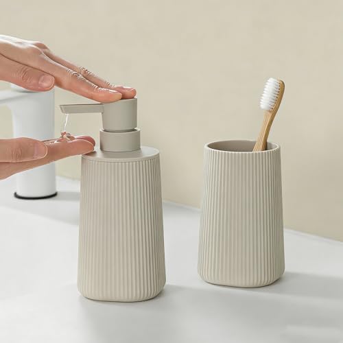 - 2-Piece Bathroom Accessory Set: A refined soap dispenser and toothbrush holder set designed to bring a clean, modern aesthetic to your bathroom countertop or vanity., Simple Modern Design: Features a vertical fluted texture and soft matte surface that adds a premium, minimalist touch to contemporary bathroom decor., Strong ABS Material: Crafted from high-quality ABS plastic that is moisture-resistant, sturdy, and built to maintain its appearance over time., Refillable 250Ml Soap Dispenser: Ideal for hand soap, lotion, or sanitizer. The smooth, downward-dispensing pump delivers controlled dispensing for a clean and effortless experience., Versatile Countertop Organization: The matching tumbler works perfectly as a toothbrush holder or makeup brush cup, ideal for bathroom vanities, guest bathrooms, or powder rooms.