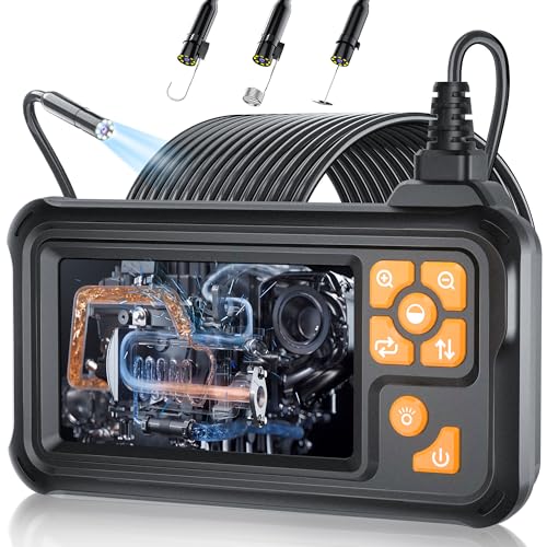 - 【Durable Industrial Snake Camera】The industrial endoscope is equipped with a 50FT semi-rigid cable can bend and hold its shape, making it easy to access various narrow spaces. This endoscope is rated IP67 waterproof and is designed to handle wet and dusty environments. It is suitable for inspection in pipes, engines, inside walls, and other complex areas., 【8 LED Lights for Clear Imaging】The snake camera with light is equipped with 8 adjustable LED lights to provide clear visibility even in dark conditions. With an 8.5mm diameter probe, it can easily enter dark and narrow spaces. The optimal focal distance is 4cm–10cm, making inspections easier and more efficient. It is widely used for automotive repair, home plumbing, and industrial inspection., 【4.3-Inch HD Display】The endoscope camera is equipped with a 4.3" IPS display featuring a 70° wide viewing angle, providing a broader and more vivid visual experience even in narrow spaces. The built-in 2000 mAh lithium battery supports approximately 2.5 hours of continuous operation. Note: This borescope camera with light does not support photo or video recording., 【Wide Application】This industrial endoscope inspects hard-to-reach areas invisible to the naked eye. As a versatile gadget, it is widely used in automotive & truck maintenance, mechanical inspection, plumbing, sewer and drain inspection.It also applies to household appliance checking, wall structure detection, electrical work, chimney cleaning and HVAC maintenance., 【Ideal Practical Gift for Men】This inspection camera does not require WiFi, an app, or smartphone pairing. Simply power it on and start inspecting immediately. With its practical design and functional features, makes a practical gift for husbands, fathers, or male tech enthusiasts., 【Practical Accessories & Quality Service】 Package includes: endoscope camera with light ×1, essential accessories (hook ×1, magnet ×1, side mirror ×1, spare clips ×3), USB charging cable×1 (*doesn't include the charging plug), user manual ×1. along with 24-hour professional customer support and a 12-month warranty.