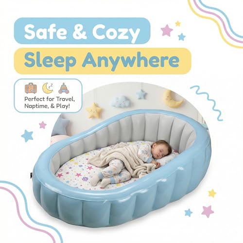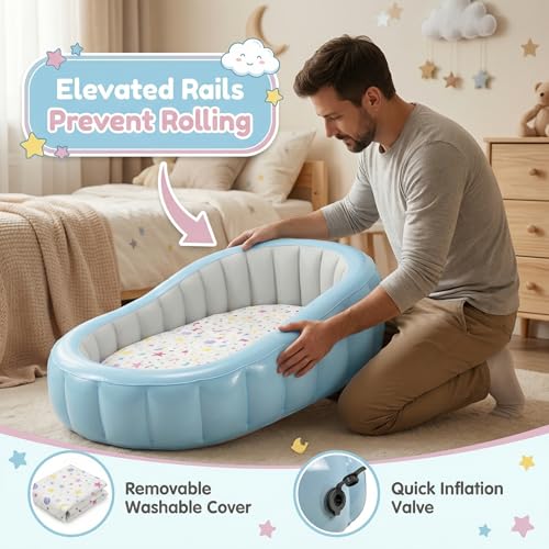 - 3-Layer Detachable Structure for Better Comfort - Features a unique 3-layer design: thickened PVC outer frame, removable air mattress, and soft 100% cotton washable cover. The inner air mattress can be separated for easy cleaning, storage, or multi-scene use, 360° Raised Safety Rails for Secure Sleep - Surrounded by elevated air-filled guardrails to help prevent rolling out during sleep. The cocoon-style structure creates a cozy sleeping space whether at home or on the go, Thickened PVC Frame with Dual Safety Valves - Made from durable, reinforced PVC material for stability and long-lasting use. Equipped with double-layer safety air valves to reduce air leakage and improve sealing performance, Portable & Travel-Friendly Design - Lightweight, compact when deflated, and easy to store. Perfect for travel, sleepovers, camping, visiting grandparents, hotel stays, or nap time, Manual High-Efficiency Pump Included - Comes with a fast manual air pump for quick inflation and deflation. No electricity required — inflate anywhere, anytime