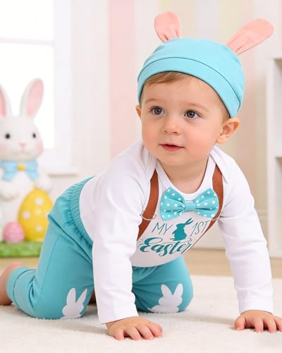 - Easter-themed design: “My 1st Easter” print paired with faux suspenders + bow tie, boys outfit featuring rabbit-print pants and a bunny-ear hat — girls romper perfect for celebrating baby's first Easte, Soft, Baby-Friendly Fabric: Our baby boy pants sets are crafted from 95% cotton and 5% spandex fabric, infant girls outfit gentle on skin and non-irritating, breathable and perfect for cool spring days, The Easter gift includes: Our little boy's Easter crewneck outfit includes a long sleeved romper, elastic-waist pants, and a bunny ear hat — baby girls set no extra styling needed for holiday photos, Versatile for multiple occasions: The white newborn bodysuit for boys is perfect for Easter first egg hunts, family brunches, church events, or spring outings, girls outfit offering a stylish look, Easy to Wash and Care: Our rabbit print baby first Easter boy set can be machine washed in cold water or hand washed; infant bunny boys outfit retains its shape even after multiple washes