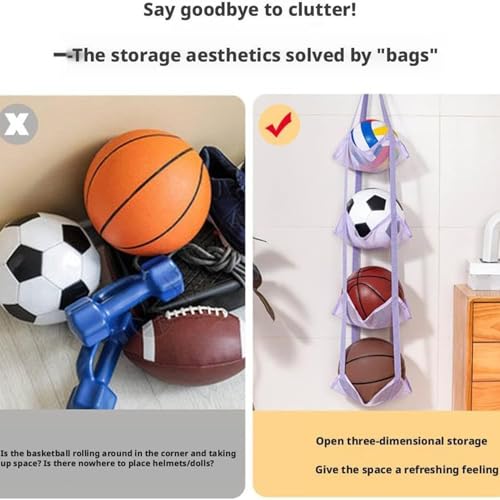 - Vertical Space Utilization: The basketball storage features a multi-tier hangable structure that maximizes vertical space utilization, eliminating floor clutter while organizing sports gear efficiently in your home gym for a tidy and functional environment, Instant Gear Retrieval: Ball Storage provides tool-free content retrieval, enabling users to access balls and sports equipment instantly without hassle, ensuring seamless preparation for training sessions or matches and improving overall convenience, Durable Seam Construction: Double-stitched seams in the sports ball storage provide outstanding strength, preventing tears even under heavy use, ensuring sports equipment stays secure and organized in homes or athletic facilities over time, Position Adjustment Flexibility: With position adjustment flexibility, the basketball holder lets users adjust its placement to suit their preferences, enhancing convenience and accessibility whether used indoors or outdoors for sports enthusiasts, Decorative Storage Solution: The Ball Organizer serves as a decorative storage solution that combines practicality with style, ensuring balls are neatly stored while contributing to the overall aesthetic appeal of your space