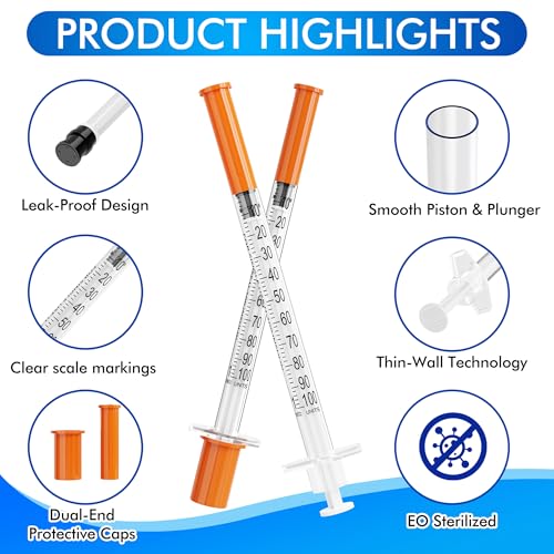 - ✓【Precise U-100 Insulin Syringes】 Each 1ml insulin syringe features a sharp, ultra-fine 30G 5/16 inch (8mm) needle designed for comfort and accurate diabetic medication delivery., ✓【100Pack Individually Sterile Wrapped for Safety】 Every disposable syringe comes individually wrapped in a sterile blister pack with a protective cap, ensuring hygiene in the pack., ✓【Clear & Accurate Dose Measurement】 Highly visible and precise markings on the syringe barrel allow for easy reading and reliable U-100 insulin dosage control every time., ✓【Smooth & Secure Leak-Proof Design】 Engineered with a smooth plunger and a tight seal to prevent medication leakage, featuring a non-slip end for easy one-handed operation., ✓【Reliable for Daily Management】 Crafted from quality materials, these sterile syringes are a dependable choice for personal insulin injection needs and precise liquid applications.
