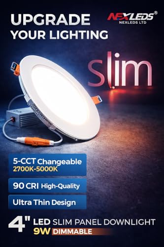 NEXLEDS 4-Inch LED Slim Panel Downlight, 9W Dimmable, 5-CCT Changeable 2700K-5000K, 90 CRI, Ultra Thin Design, Wet Location Rated