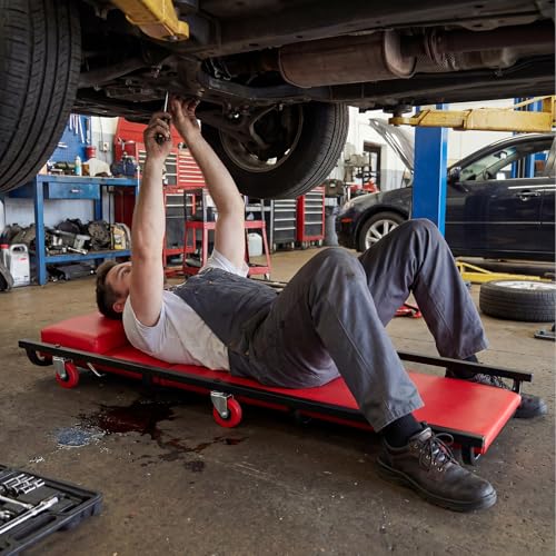 - Multi-Angle Support: The rolling creeper features a 4-level adjustable backrest, allowing you to customize the angle for various repair tasks. Its convenient bottom latch makes switching positions quick and effortless., Multi-Layer Comfort: Constructed with multiple layers including PVC leather, EPE foam, soft sponge, MDF, and non-woven fabric, this mechanic cart provides superior cushioning. The thickened headrest ensures enhanced comfort, reducing strain while you work underneath vehicles., Robust & Reliable Metal Support: Built with a sturdy metal frame featuring deformation resistance, this creeper supports up to 250 lbs. Moreover, the well-coated surface ensures reliable performance and long-lasting use., Smooth & Flexible Mobility: Coming with 6 universal casters, this low-profile creeper glides effortlessly across your garage floor. The 360° swiveling casters are also wear-resistant and low-noise, making the creeper perfect for workspace., Workspace Efficiency Booster: Ideal for garages, repair shops, and tool rooms, this mechanic creeper enhances your workflow. It helps improve efficiency and convenience in any DIY or professional vehicle maintenance setting.