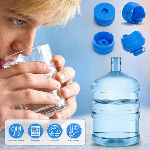 - Safe Material: The 5 gallon water jug cups are made of food-grade silicone, reusable and eco-friendly to reduce plastic waste. Safe and heat-resistant, dishwasher safe., Excellent Sealing: The thickened silicone water bottle lid fits tightly around the jug mouth and stays securely in place without floating or falling into water, keeping dust and impurities out to ensure water safety. It also prevents water leakage during transportation or storage, even if the jug is tilted., Wide Compatibility: The 5 gallon water jug cap is suitable for most water dispensers. Compatible with 2, 3, 4 and 5-gallon water jugs with standard, screw-top or crown caps. Fits jug mouths with a diameter of 55–60 mm., Easy to Install & Remove: First, flip the inner of the lid outward; align the jug mouth and flip the edge back to achieve a perfect seal. The built-in pull tabs on reusable 5 gallon water jug cap both sides allow for quick removal by simply lifting upward., Multi-Scene Use: The reusable 5 gallon water jug cap ideal for home, office, camping, picnics and more. Preserves fresh drinking water without affecting the heating function of your device.