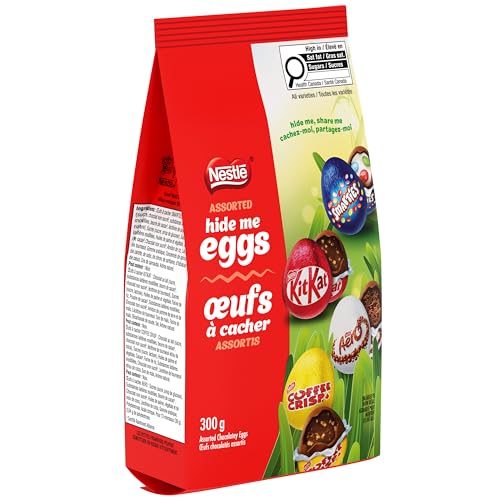 - The Perfect Easter Candy: This family pack of NESTLÉ Assorted Hide Me Eggs contains miniature chocolatey egg-shaped versions of your favourite NESTLÉ treats, All Your Favourites In One Bag: Enjoy KITKAT milk chocolate eggs filled with crispy wafer pieces, SMARTIES milk chocolate eggs filled with miniature pieces of SMARTIES, COFFEE CRISP milk chocolate eggs filled with delicious COFFEE CRISP flavour and crispy wafers, and AERO milk chocolatey eggs filled with AERO's classic bubbles, Individually Wrapped: NESTLÉ Assorted Hide Me Eggs are individually wrapped in foil, just right for egg hunts, Easter baskets, and sharing with family and friends, Natural Flavours & No Artificial Colours: These miniature chocolatey eggs are made with natural flavours and no artificial colours, NESTLÉ Cocoa Plan: In collaboration with the Rainforest Alliance, the NESTLÉ Cocoa Plan is helping cocoa farmers enhance farming practices, Proudly Supporting Kids Help Phone: For more than 34 years, NESTLÉ Canada has raised millions for Kids Help Phone, Canada's only 24/7, free, confidential, and multilingual e-mental health service