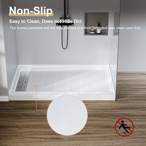 - Slip-Resistant Surface: Built with high-strength sheet moulding compound, this shower base features a textured anti-slip finish that improves traction during daily use, suitable for family bathrooms, senior users, and child-friendly bathing spaces, Flexible Install Method: Designed for multiple installation conditions, this shower pan can be set flush with new subfloors for accessible entry, or raised about one inch over existing floors, helping reduce renovation work, labour time, and retrofit cost, Single Threshold Edge: Integrated single threshold barrier helps contain water inside the bathing zone, reducing overflow onto surrounding tile and floor areas, ideal for home bathrooms, apartment remodels, guest bath upgrades, and replacement projects, Removable Drain Cover: Includes a square stainless steel drain cover that lifts out easily for pipe access and routine cleaning, simplifies maintenance tasks, supports faster debris removal, and improves long-term drainage performance in daily shower use, Low Maintenance Finish: Non-porous surface allows quick wipe cleaning and resists common bathroom stains, roomy showering area adds comfort for everyday routines, suitable for residential bathrooms, rental properties, and light commercial washrooms