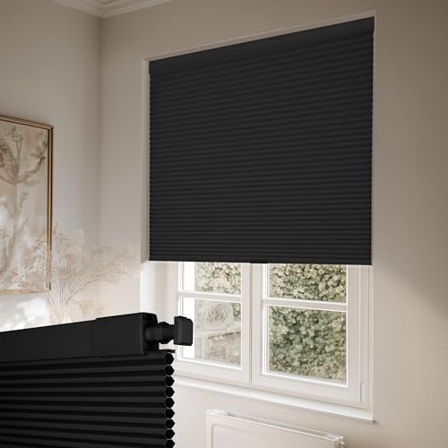 - [Perfect Light Blocking And Heat Insulation]--Made of top quality non-woven fabric. The shade itself features a 100% blackout fabric and an insulating cellular design that helps maintain your indoor temperatures during both winter and summer, noise reduction, UV protection, dust proofing. Shade is the same color on the front and back, and includes color-coordinating headrail and bottom rail, [Easy to Install] No Tools-No Drill Design allow cellular shades cordless no need to drill any holes on your window frame, easy to Install in 30 seconds. No need to worry about damage to the wall caused by drilling holes, [Excellent Details] We have made improvements for the common problems of the products on the market, lamellar spring system has passed more times usual lifting or pulling down tests. Makes it retracts and extends smoothly with constant force stay balanced automatically. Made of non-woven fabrics, after exposed to sun light for years, window cellular shades will still keep almost the same, no peeling off, no cracking, no color changing and no unpleasant smell, [Cordless System] Easy to raise up or lower down. No tangled cords, No exposed lift cords! Smooth and quiet glide spring system provides a clean and tangle-free look and creates a safer environment for both pets, [Trusted Service] Choose from our size list if you know what you need, or opt for custom sizing by providing your window dimensions. We'll double-confirm the size with you via email for a worry-free ordering experience.Once we confirm the size, we promptly craft your no-drill cellular shades for swift delivery. Feel confident with a 12-month quality guarantee on our cordless cellular shades