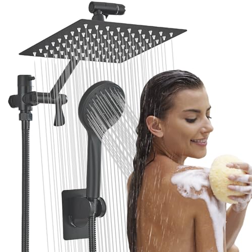 Matte Black Shower Head, High Pressure Rainfall 8 Inch Shower Head/Handheld Showerhead Combo with 10" Extension Arm, Height/Angle Adjustable