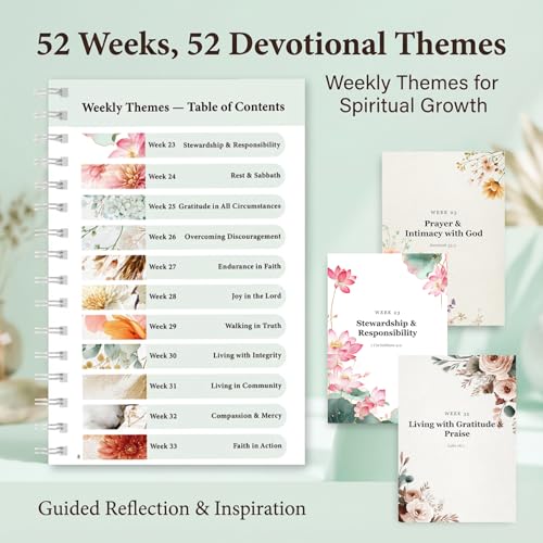 - 52 Weeks, 52 Devotional Themes (Guided + Simple): Follow a guided devotional journal format with 52 weekly themes for spiritual growth—designed to help you stay consistent without feeling overwhelmed. A structured Bible study journal that keeps you focused week by week., Scripture Reading Plan + Checkboxes (Easy to Follow): Each week includes a clear scripture reading plan (daily passages) with checkboxes, so you can track progress at a glance. Great for anyone searching “Bible in a year journal”, “daily Bible reading plan”, or “guided Scripture references”., Reflection Prompts That Go Deeper (Not a Commentary, Not a Printed Bible): Includes reflection prompts and guided journaling space to help you apply God’s Word personally. This is a guided journal (not a printed Bible / not a verse-by-verse commentary)—it’s built for studying, praying, and writing your takeaways., A4 Large Format + Lay-Flat Spiral (Write Comfortably): Big A4 size (8.25” x 11”) gives you roomy writing space for notes, prayers, and gratitude journaling. Durable spiral binding lays flat for easy writing—ideal for desk study, church groups, or quiet time at home., Includes Bible Index Tabs (Quick Navigation & Study Setup): Comes with Bible index tabs to help you find books faster and build a smoother study routine. A meaningful gift for believers—perfect for birthdays, Mother’s Day, Christmas, New Year renewals, and women’s ministry groups.