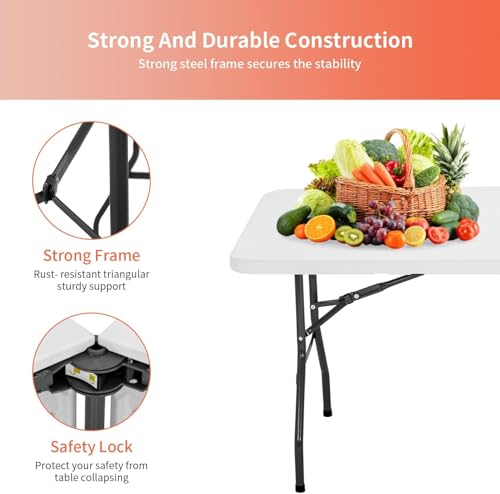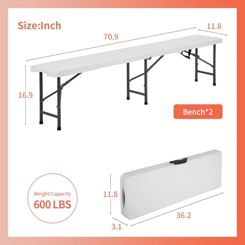 - 🌟Folding Design: This camping table is only a small box size when folded. Whether you are going for an outing or a picnic, it can be placed in the trunk of the car, which does not occupy a space. It is also suitable for small living rooms., 🌟Reinforcement Design: The picnic table chassis adopts honeycomb reinforcement design to make the folding table and chair more stable, and the anti-arch design is also adopted in the middle, which is solid and durable., 🌟Robust Structure: the heavy steel frame of the folding table and the HDPE table top complement each other, with robustness and wear resistance; It is equipped with safety lock and fixing buckle to increase stability., 🌟Dimensions: Table Dimensions 71" x 29" x 29" (L x W x H), Folding Dimensions 35" x 29" x 3" (L x W x H),Bench Dimensions12"D x 71"W x 17"H (L x W x H),Folding Dimensions 36" x 11" x 3" (L x W x H),this outdoor folding table set are spacious enough to accommodate 4-6 adults for events compact grill, snacks, fruits and cakes., 🌟No assemble needed:The folding table and bench set come fully assembled.