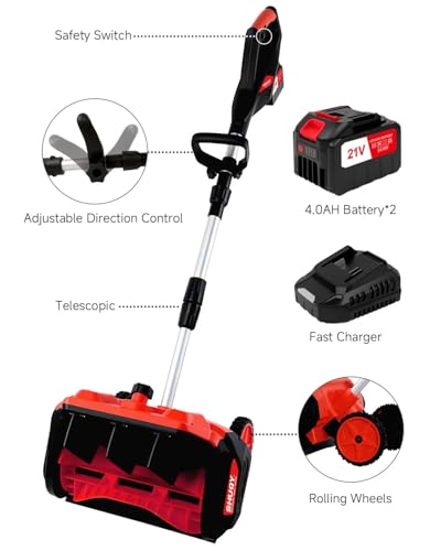 Cordless Electric Snow Shovel with Wheels, 17 Inch Brushless Snow Blower, 2×4.0Ah Large Battery & Quick Charger, Directional Plate, Support Wheels for Smooth Back-and-Forth Operation