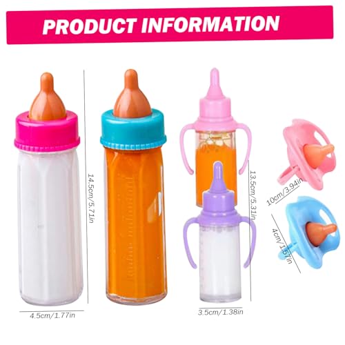 - Perfectly Sized for Little Hands: Crafted to be perfectly sized for little hands, these baby bottles for dolls are ideal for children to engage in nurturing and role-playing activities., Package Content: This set includes 2 regular baby bottles, 2 baby bottles with handle, and 2 pacifiers, making it perfect for sharing with friends or ideal for families with multiple children., Safety First: Crafted from safe PP material, these baby doll bottles are non-toxic and resilient, ensuring that children can play with them safely, fostering curiosity and attention to detail while providing peace of mind for parents., Fun to Play: The baby doll bottles feature a captivating design that provides a realistic drinking experience. As you tilt the bottle, the juice or milk inside decreases and gradually disappears, mimicking the act of drinking. When placed upright again, the liquid ally reappears, adding an of surprise and delight to playtime., Versatile and Thoughtful: These baby doll bottles are suitable for various play scenarios, such as pretend play and tricks, making them an excellent for children. Their adaptability allows for creative and imaginative play in a variety of settings, providing endless entertainment and opportunities for self-expression.