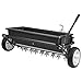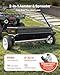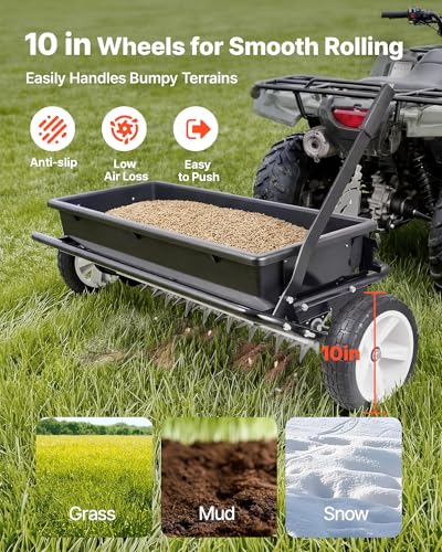 - Spreading & Aeration Function: Equipped with 72 aeration tines, the lawn spreader loosens and aerates your lawn to enhance soil softness. With 32-in spreading width and 15 settings, it allows precise control for grass seeds, fertilizers and ice melt distribution, Durable Material: Made with powder-coated steel frame and explosion-proof hopper, this broadcast spreader offers UV resistance, rust protection and impact durability. Paired with 10-inch turf-friendly tires, it adapts to all terrains including lawns, gravel and snow for outdoor use, Wide Compatibility: Our tow behind spreader comes with universal hitch design that make it compatible with most tractors, ATVs and UTVs on the market, delivering unrestricted usability for different scenarios, 85 lbs Heavy Loading Capacity: The seed spreader aerator features high-capacity hopper that help reduce refilling frequency significantly, allowing you to concentrate on gardening work, improve operational efficiency, and save both time and effort, Year-Round Versatility: The tow spreader with aeration spikes is ideal for spring seeding, summer fertilizing, fall weed control, winter ice melting. This all-in-one tool replaces 4 separate devices, catering to diverse needs from household lawn care to small-scale farm maintenance