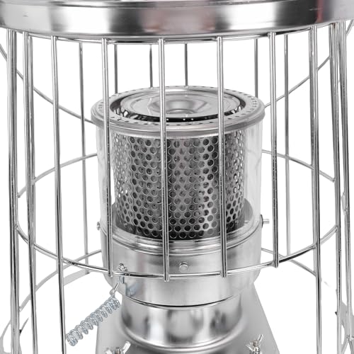 - This portable kerosene heater operates without electricity providing reliable heat for indoor and outdoor areas during power outages or remote trips., Efficient 12000BTU/H output delivers substantial warmth using kerosene fuel for energy effective and quiet operation in various spaces., Featuring a built in carry handle and weighing 178.13oz this heater is easy to transport for use in garages basements or camping sites., An integrated anti tip protection mechanism adds safety during use while the 6L fuel capacity allows up to 30 hours of runtime., Versatile heating solution suitable for family rooms workshops sheds and outdoor activities where portable warmth is needed.