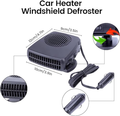 - 【High Quality】 Portable car heater adopts ABS material, high heat conversion, no open fire, safe and instant heating. Cigarette lighter plug is built with fuse for safety use, providing auto power off protection., 【 Design】The car heaters adopts cigarette lighter plug design, built-in fuse, automatic power-off protection, anti-voltage, and safer to use. Rotate the bracket 360° , and you can fix the heater where you like. And adjust it to the angle you like., 【2 IN 1 Modes Portable Car Heater】Car Heater Available all yearWith hot and cold switch. Adjustable wind mode, can be used as cold wind and warm wind. Just change the switch, and the hot or cold air will come out immediately according to your needs. This car heater is not only very suitable for defrosting/defogging car windows and windshields. It can also be used as a cooling fan., 【Easy To Install And Use】The angle of rotation can be used to allow passengers and drivers to blow out the required cold or warm air, defroster heater is small and exquisite, will not block the line of sight, and can be safely driven in winter, just plug it into the cigarette lighter of the car. Press the fan or heater switch, the fan starts to work. Fans can be used in summer and heating can be used in winter., 【Wide Range Of Application】Just plug it into the cigarette lighter socket of the vehicle and turn it on, Widely used in common electrical appliances such as automobiles, air conditioners, SUVs, taxis, jeeps, trucks, etc. Suitable for all 12V vehicles in the car, camping and traveling, defogging/defrosting in winter and cool in summer.
