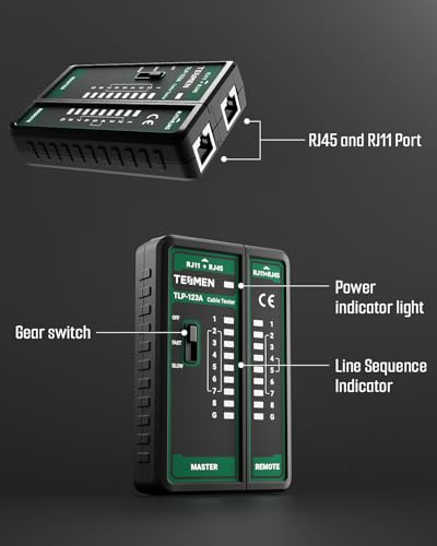- Multifunctional Network Cable Tester: TESMEN TLP-123A Supports RJ45 and RJ11, enabling rapid detection of line connectivity, short circuits, open circuits, miswiring, and cable shielding status. An essential tool for troubleshooting line faults and network maintenance, it effectively boosts your work efficiency, Convenient and Efficient: Featuring one-button operation and a test speed adjustment gear on the main control unit for enhanced flexibility. Clear LED indicators provide intuitive test result displays, making it easy for both professionals and home users to operate, Portable and Durable: Compact and lightweight design for easy portability. Constructed with high-quality plastic housing for robust structure, ensuring both durability and stability. Ideal for home wiring, IT equipment setup, electrical maintenance, and LAN DIY projects, Detachable design: The main control unit and remote unit can be separated and used independently, allowing you to test both ends of long cables. This makes it ideal for wall-mounted ports, long-distance cabling, or structured cabling systems, perfect for homes, offices, or professional IT environments, What you will get: 1 * TLP-123A Network Cable Tester, 1 * user manual, 2 * AAA batteries